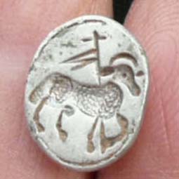 A small Silver pin with The Lamb of God. |